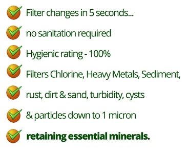 EcoFIT® Ps300 Quick-connect Triple Stage System Filters 99.9% of Chlorine and organic chemicals by enhanced reduction of sand, rust and particles down to 1 micron in size and volatile compounds from drinking water for better tasting water. EcoFIT® Quick-connect filters make cartridge replacement super hygienic, easy and FIT without the contact of filter media being exposed to outside germs. In Fact each time you replace our filter, you get a new housing as well which equivalates to a brand new filtering system every time your cartridge is replaced. There is no need to sanitize or clean your existing filter housing, its done for you! No mess, No Fuss, Just remove the old and install the new in 5 seconds....
